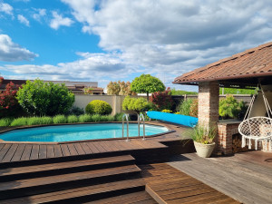 fűthető, téliesíthető medence (6,5 x 3,5 x 1,2 m) hőszivattyúval és vízforgató rendszerrel, amely egész évben élményt nyújt