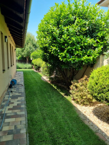 parkosított kert automata öntözőrendszerrel, gondozott növényzettel